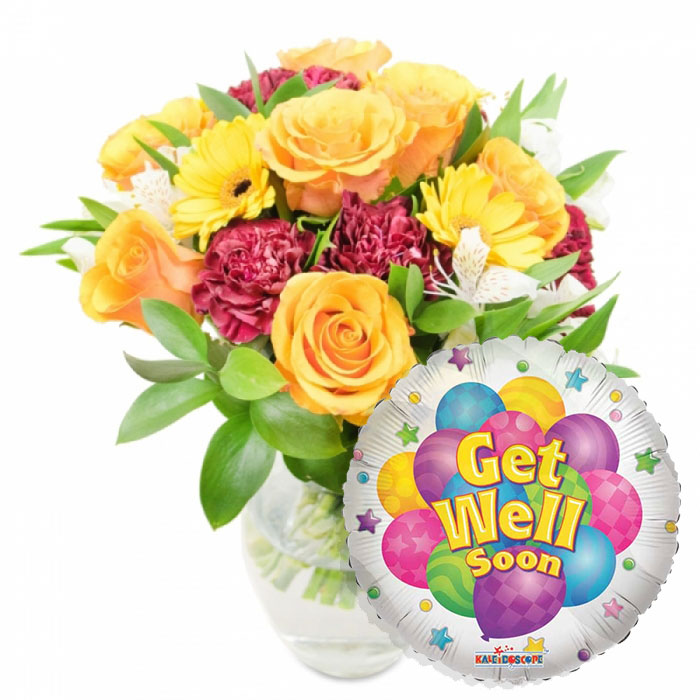 Illuminate a loved one's recovery with our Glow Get Well Bouquet, a stunning and vibrant arrangement designed to inspire and uplift. This exquisite bouquet features radiant yellow roses combined with sunny yellow germinis and passionate red carnations, creating a harmonious and joyful display.