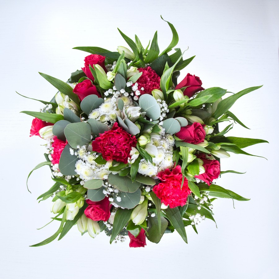 Celebrate the beauty and uniqueness of our Sophisticated Grace Bouquet. This elegant arrangement features pure white chrysanthemums, soft gypsophila, luxurious red roses, and vibrant carnations, artfully arranged with white alstroemeria and aspidistra leaves.