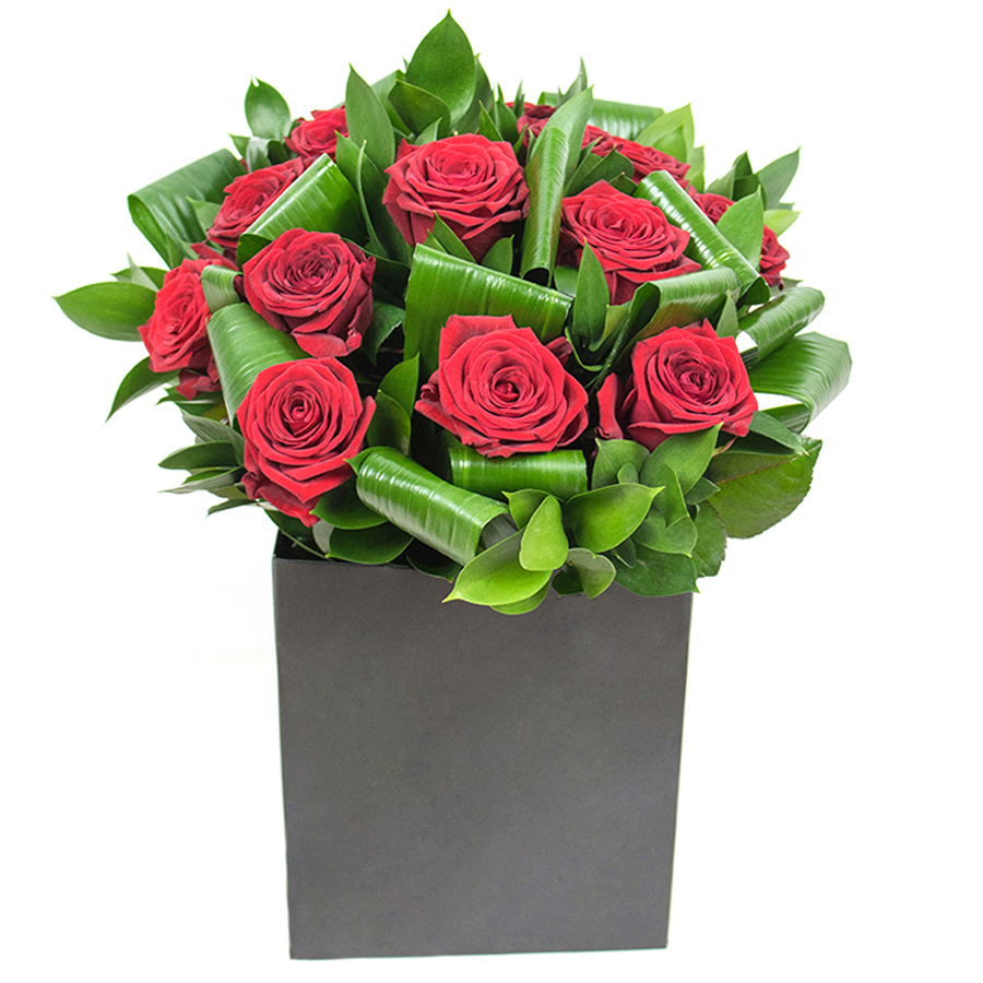 This exquisite floral arrangement features the timeless beauty of deep red roses paired with delicate aspidistra leaves and graceful ruscus. Designed to captivate, each flower is meticulously hand-picked to ensure the highest quality and exceptional freshness.